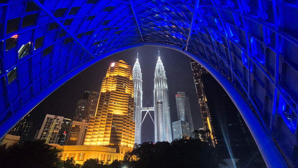 Am Abend sind wir zur Wasser- und Lichtshow an den Petronas Towers gefahren. Die Petronas Towers am Abend zu bestaunen ist absolut sehenswert. Die Wasser- und Lichtshow hingegen fand ich etwas langweilig. Was ihr anschließend unbedingt noch einplanen solltet, ist der Besuch der Saloma Link Bridge. Wenn ihr im Park der Petronas Towers steht, müsst ihr einmal um die Türme herumgehen, die Straße überqueren, um die schmale Passage zur Saloma Link Bridge zu erreichen. Diese solltet ihr unbedingt im Dunkeln einplanen. Von dort aus habt ihr einen unglaublichen Blick auf die Petronas Towers mit der beleuchteten Brücke – ein absoluter Eye-Catcher.