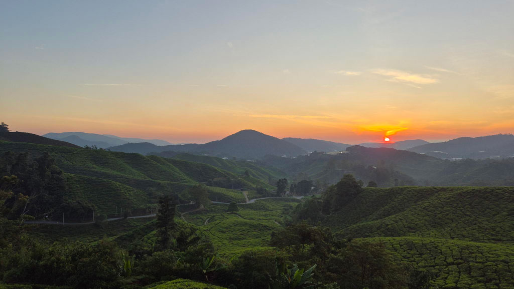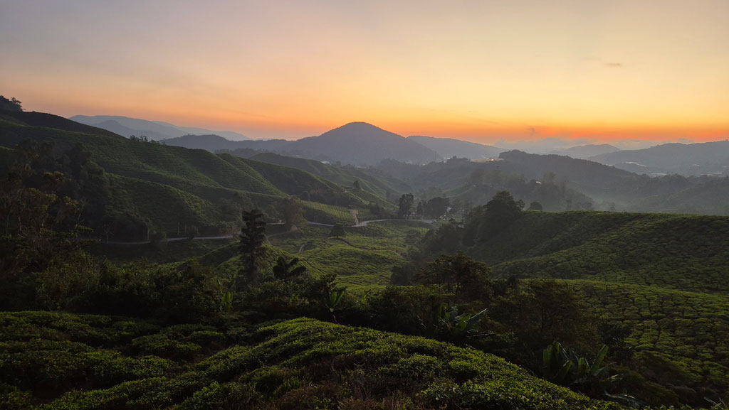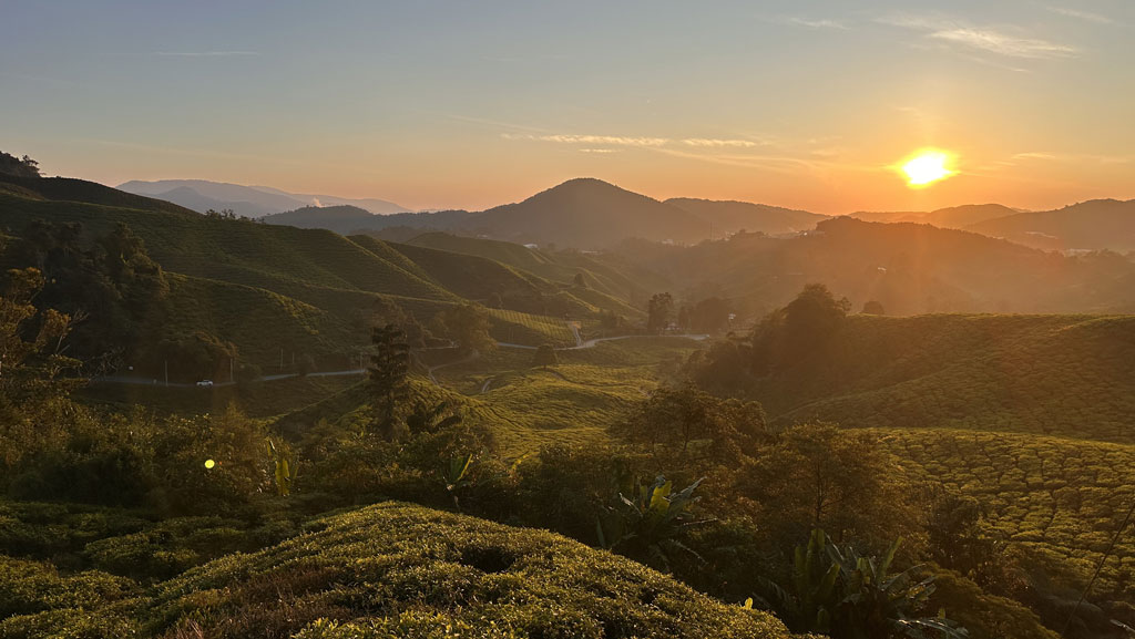 Für den übernächsten Tag (Dienstag) haben wir uns in Tanah Rata eine Halbtagestour zum Mossy Forest und zum BOH Tea Center gebucht. Das BOH Tea Center (Sungei Palas Garden) hat montags immer geschlossen, da hier die Mitarbeiter ihren freien Tag haben. Daher sind wir am Montagmorgen noch im Dunkeln zur Straße des BOH Tea Centers zum Sunrise View Point gefahren, um den Sonnenaufgang über den Teeplantagen zu genießen. Ich habe selten einen so atemberaubenden Blick auf ein Tal während der aufgehenden Sonne erlebt. Ein absolutes Muss! Also bitte bei eurem Besuch in den Cameron Highlands einplanen. Mittags hat es lange und stark geregnet, weshalb wir einen entspannten Tag eingelegt haben.