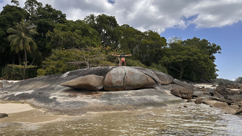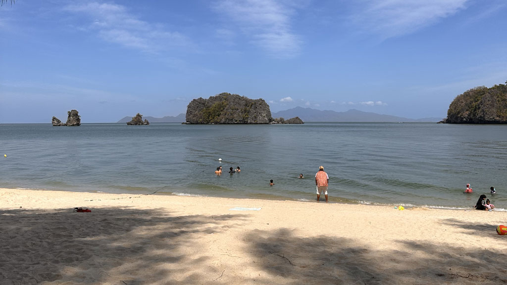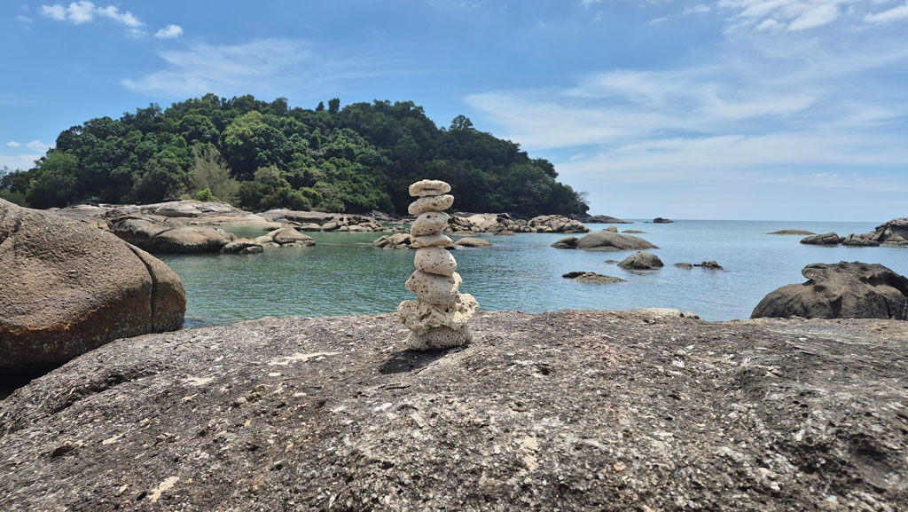 Diesen Ausflug könnt ihr gut mit dem Strand Tanjung Burau Karang verbinden. Wir haben von der SkyCab ein Grab zu dem Strand gerufen. Der Weg kam uns jedoch sehr kurz vor, sodass man die Strecke vermutlich auch problemlos zu Fuß nach unten laufen kann. Am Strand angekommen, solltet ihr nach rechts, entweder am Strand entlang und durch das flache Wasser oder über den Weg etwas oberhalb laufen. Zwischen den Felsen findet ihr eine kleine abgelegene Bucht, in welcher ihr etwas ungestörter seid. Dort kommen nur sehr wenige Leute vorbei – perfekt für einen entspannten Sonnentag. Wenn ihr weiter nach rechts über die größeren Felsen geht, gelangt ihr zu einem langen, schönen Strand.